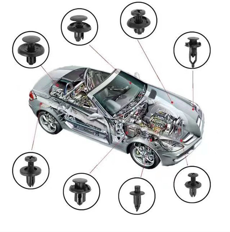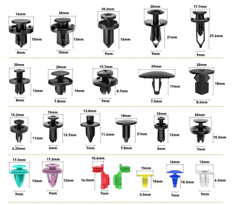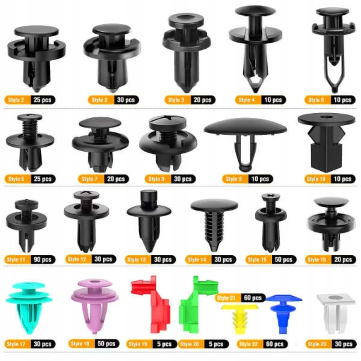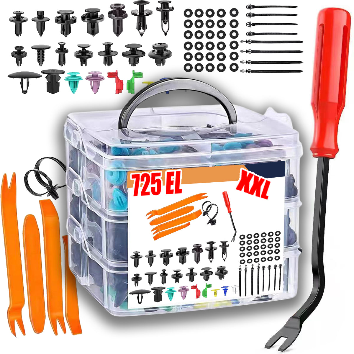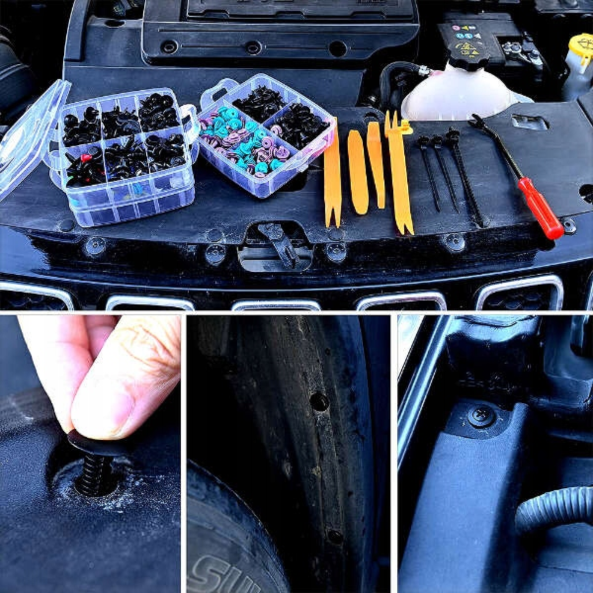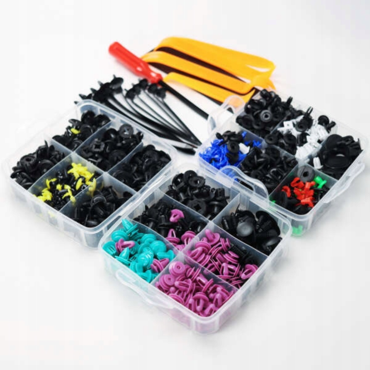 Uniwersalny zestaw montażowy, idealny do naprawy i wymiany klipsów, kołków i spinek tapicerki, osłon nadkoli, zderzaków oraz wielu innych elementów wewnętrznych i zewnętrznych samochodu. Pasuje do większości marek i modeli aut osobowych oraz dostawczych.
